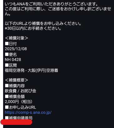 欠航理由が天候不順ではなく、航空会社起因でしたので大阪までの新幹線代の差額とお弁当代2000円分の補償がありました。欠航が決まってしばらくすると、登録しているメールアドレスにANAから次のようなメールが来ました。