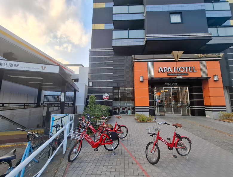 東比恵のアパホテルは地下鉄の駅徒歩20秒のところに位置していて、エントランス前にはチャリチャリのポートも完備というなんと便利なアパホテル。